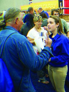 Allie Nunn (right), the youngest NMLRA director in the history of the Association, standing in front of the NMLRA booth recruiting members and answering questions.