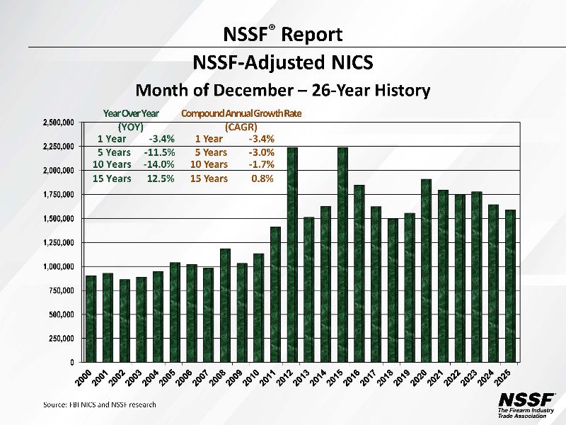 Special to TGM The December 2025 NSSF-adjusted National Instant Criminal Background Check System (NICS) figure of 1,587,049 is a decrease of 3.4 percent compared to the December 2024 NSSF-adjusted NICS...