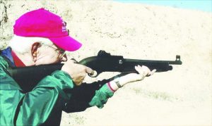 The author at the annual SHOT Show Media Day range trying out a new 12-gauge autoloading shotgun with great open sights. (A scope or red dot could easily be mounted on the receiver rib.)