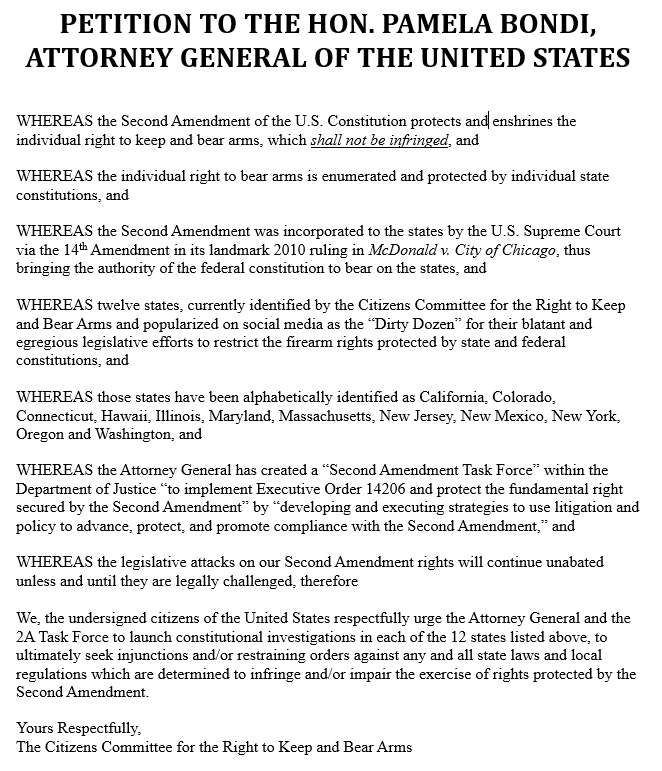 The Citizens Committee for the Right to Keep and Bear Arms has launched an online petition to Attorney General Pam Bondi in an effort to stress support for Second Amendment Task Force investigations starting with 12 states recently listed by the committee, and dubbed by pro-rights commentators as the “Dirty Dozen.”