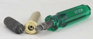 Remove primer pocket crimps from military brass with a swage, such as this press-mounted kit from RCBS, or with a cutter. The Sinclair cutters can be mounted in a handle or chucked in a drill press for high volume work.