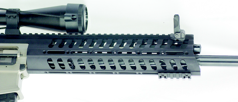 The P308 arrives without sights or optics. So I added a set of Knights Armament (701 Columbia Blvd, Dept TGM,Titusville, FL 32780; phone: 321- 607-9900; online: knightarmco.com) offset back-up sights. This combination would allow the end user to run the P308 for hunting (if it is legal in your state), range use or three-gun competition. The iron sights were zeroed at 50 yards and the optics at 100 to give the most versatility in real world use. The other addition was to replace the VLtor with a Magpul MOE with a Battleline SAPR fully adjustable assembly. These additions will allow the rifle to be used for hunting, three-gun, and precision rifle shooting; just about anything you wish to do with it.