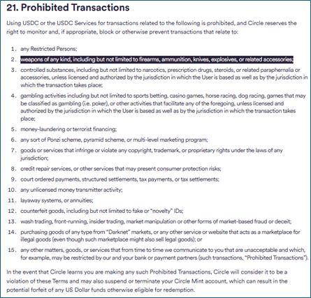 Circle Internet Group, issuer of the U.S. Dollar Coin (USDC), hid a clause deep in its published terms of service that bans consumers from using USDC to purchase “weapons of any kind, including but not limited to firearms, ammunition, knives, explosives, or related accessories.”