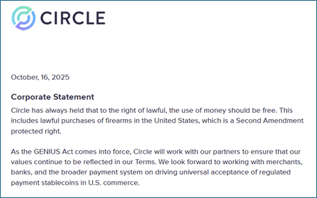 Lawmakers wanted to encourage innovation while protecting consumers and reinforcing America’s leadership in financial technology. While Congress debated how to make stablecoins safer and more transparent, one of the industry’s largest players was quietly writing its own rules, creating a system that treats lawful firearm purchases as a prohibited activity.