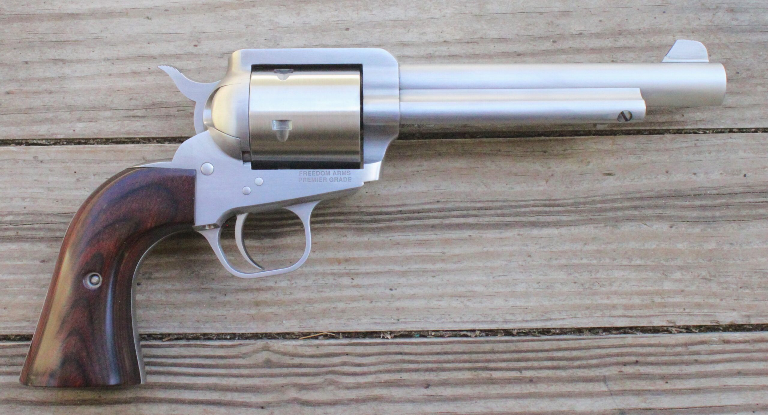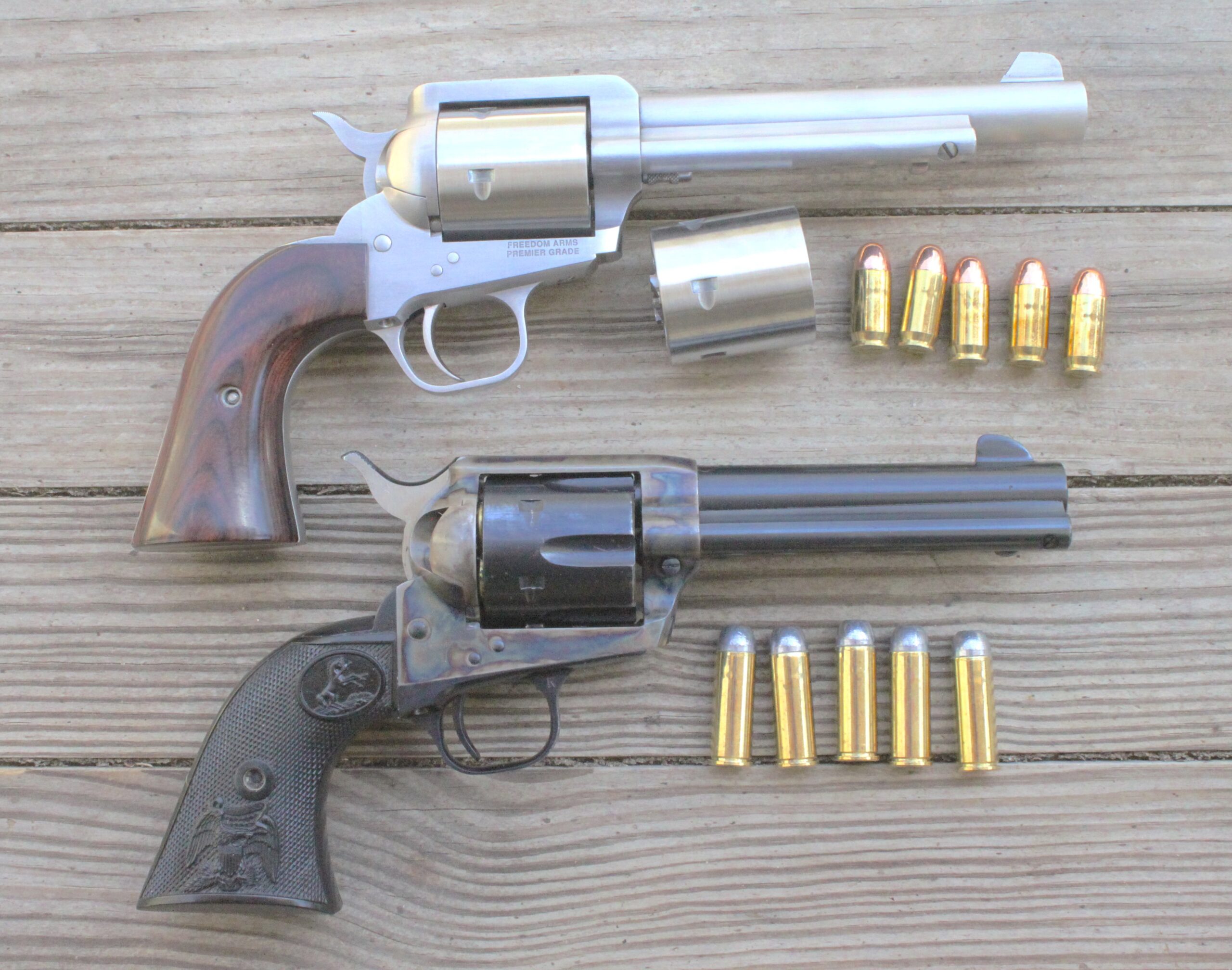 The stainless steel Freedom Arms M1997 and a Colt Single Action Army Model 1873 for comparison.