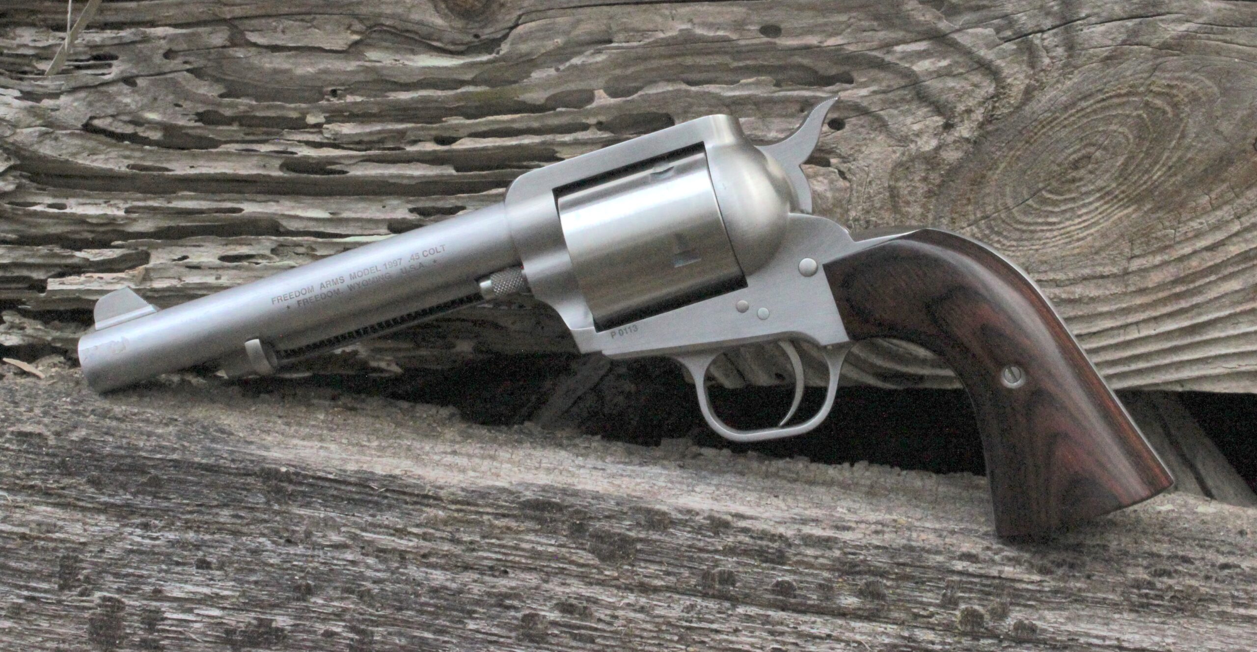 Freedom Arms was founded in 1978 with the first guns being produced in 1979. In 1983 they introduced their M83 in .454 Casul. This was scaled down 10% in 1997 to produce their M1997 in .45 Colt and .45 ACP. These come with either a 4½-inch or a 5-½ inch barrel. You can have fixed or adjustable sights and there is also a dovetail front sight option allowing for adjustment of the front sight if desired. Wood grips are standard but as an option you can get either black or tan micarta grips.