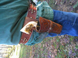 Getting a holster for a Colt-style Navy or Army revolver is rather easy. Any holster for the Colt Single Action Army with an appropriate barrel length will fit. I like to carry my .36 Navy with the 5-inch barrel in a cross-draw holster. That keeps the gun handy but also out of the way in case I’m also carrying a rifle on the same trip down the trail.