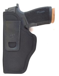 I used the DeSantis Super Stealth holster during the evaluation. This holster is built of rugged ballistic nylon featuring a GRD gun retention device, which locks solidly on the pistol. Simply yank the pistol from the holster and you have a sharp draw. Fit is good, and concealment inside the waistband is excellent. A sturdy clip takes a strong hold on the belt. The frame design was no drawback with this holster.