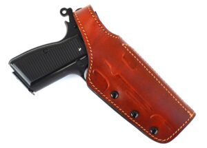 The holster is a Falco (Falcoholsters.com) C116. The leather is nicely tanned and workman ship is excellent. This holster makes for comfortable and secure carry during the daily walk and when hiking for exploring. The Centurion is a fun gun and one that provides shooters a similar experience to firing the original at a fraction of the cost.