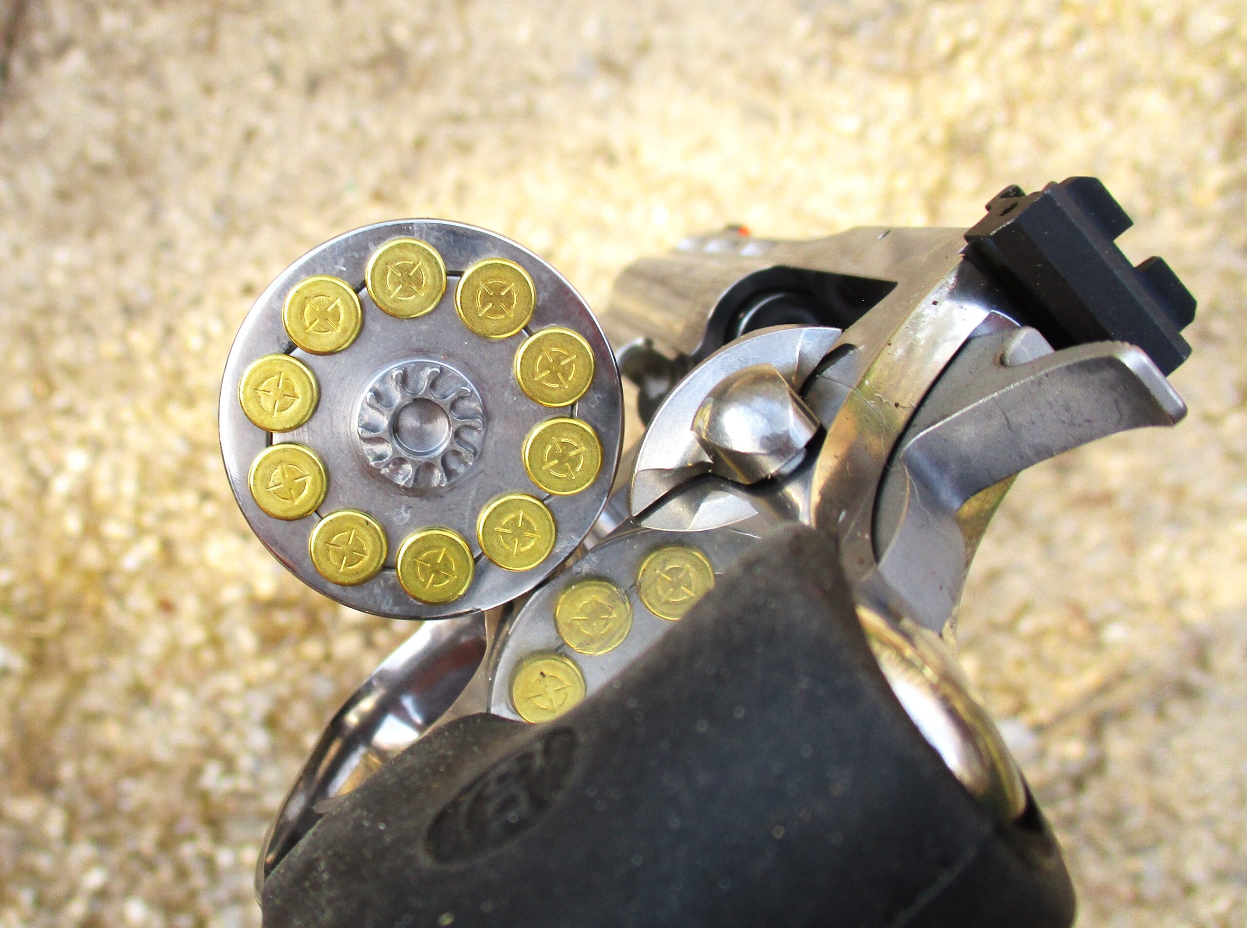 The King Cobra’s ejector rod has sufficient length of travel to push even loaded cartridges completely free of the chambers unlike some revolvers made today. Always hold the gun with the muzzle straight up when ejecting fired cases from a swing out cylinder gun to insure that a fired case does not fall between the cylinder and the extractor where it can tie up the gun until you claw it out. You just might not have that time if someone is shooting at you or a pack of wild dogs is coming at you.