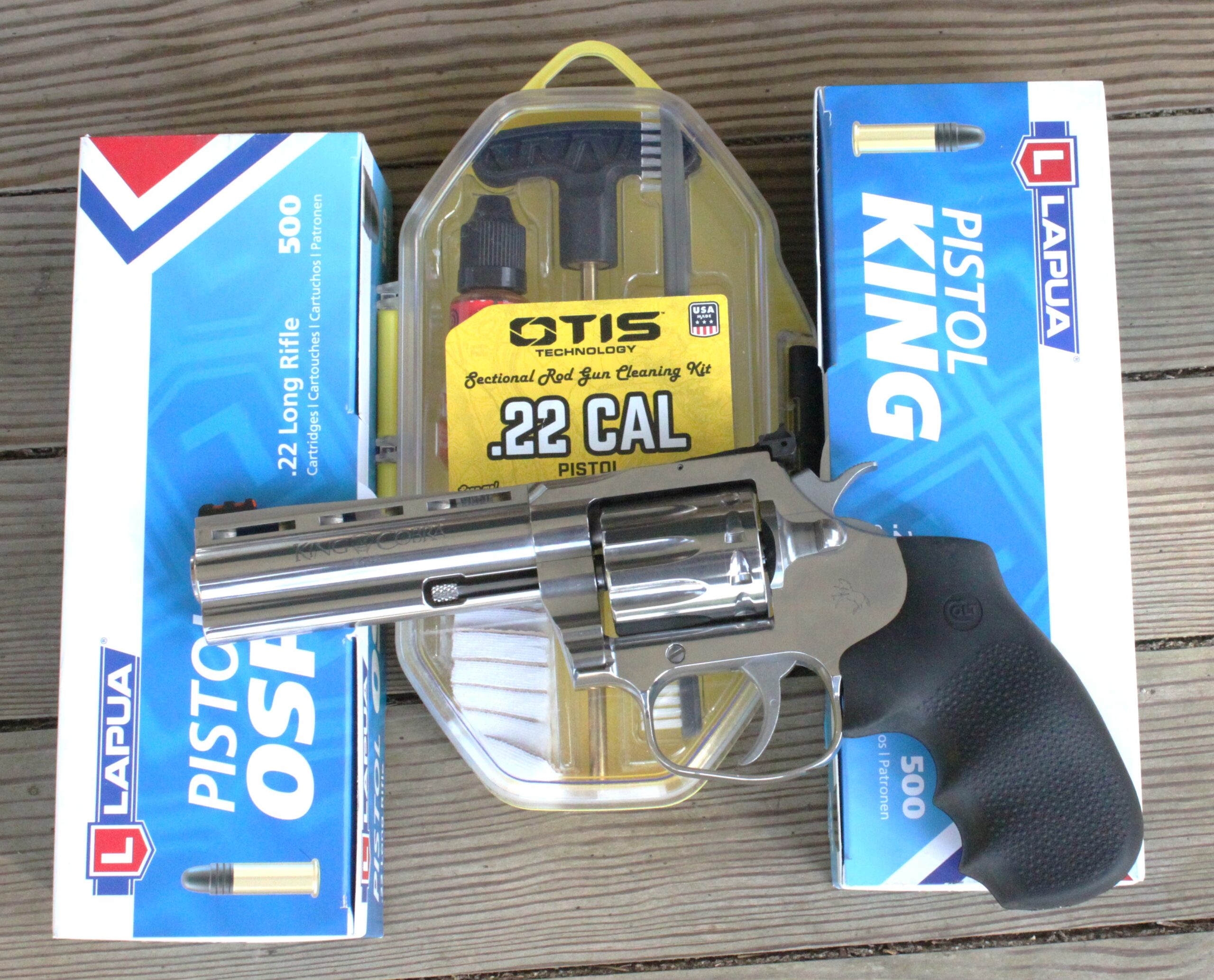 Here’s the Colt King Cobra and the ammunition test fired with it, along with the cleaning kit used afterwards
