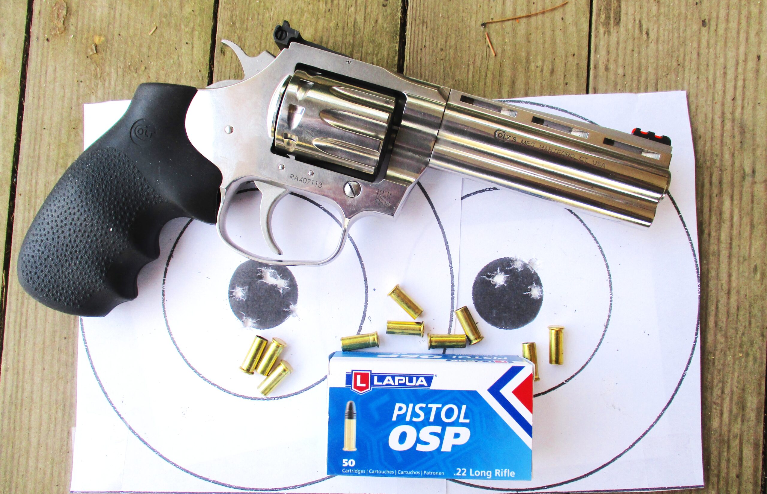 Jim shot the Colt King Cobra, producing these excellent groups with Finnish Lapua Pistol King .22 ammunition imported by Capstone Precision Group.