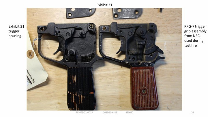 “To demonstrate the functionality of Exhibit 30, I elected to test fire the Exhibit. I utilized a trigger assembly, firing pin, and firing pin spring from an RPG-7 from the NFC and installed these components in Exhibit 30,” he wrote.