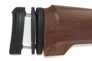 The stock is well designed to mitigate recoil. The angle of the stock requires an adaptor and shorter bolt once the factory stock is removed. This is a strong attachment. The angle of the stock allows a locked wrist rather than the usual angled grip common with shotgun. This alone makes a considerable difference in handling. The stock is properly pebbled for greater adhesion and abrasion.