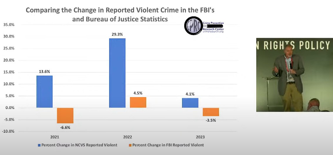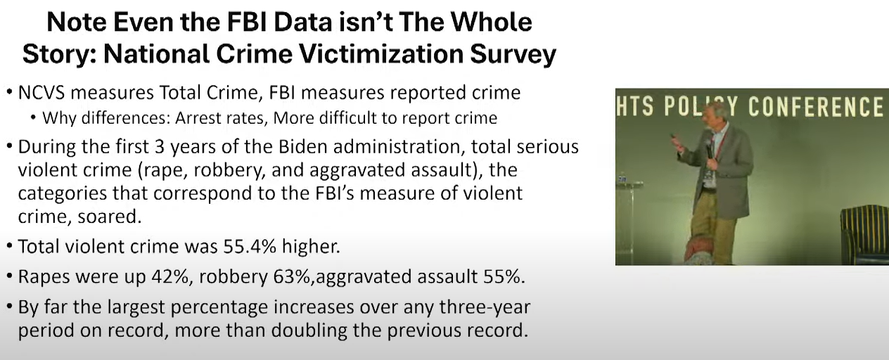 Lott did his presentation with a series of slides and illustrations, one of which showed how crime went up dramatically during the first three years of the Biden administration.