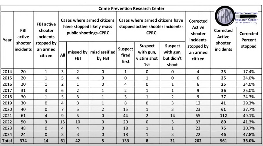 Lott worked for the Justice Department during the first Trump administration as a senior advisor on statistics, which afforded him the opportunity to look at active shooter cases. He suspects that about 36 percent of all active shooting cases over a 10-year period from 2014 to 2024 were stopped by armed private citizens.