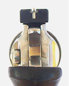 The barrel is a heavy underlugged type. A solid integral rib sets atop the barrel. The barrel crown is very nicely done. The front sight is pinned in place. Both the ramp and sight post are nicely serrated. The rear sight is a fully adjustable unit with a serrated rear face and white outline. The cylinder locks in tight. While Ruger uses a plunger for lock up the crane of the Manurhin revolver locks up on a stud mounted in the frame. The MR 88 features a sideplate unlike Ruger revolvers. The cylinder release is Ruger type; no need to mess with success.