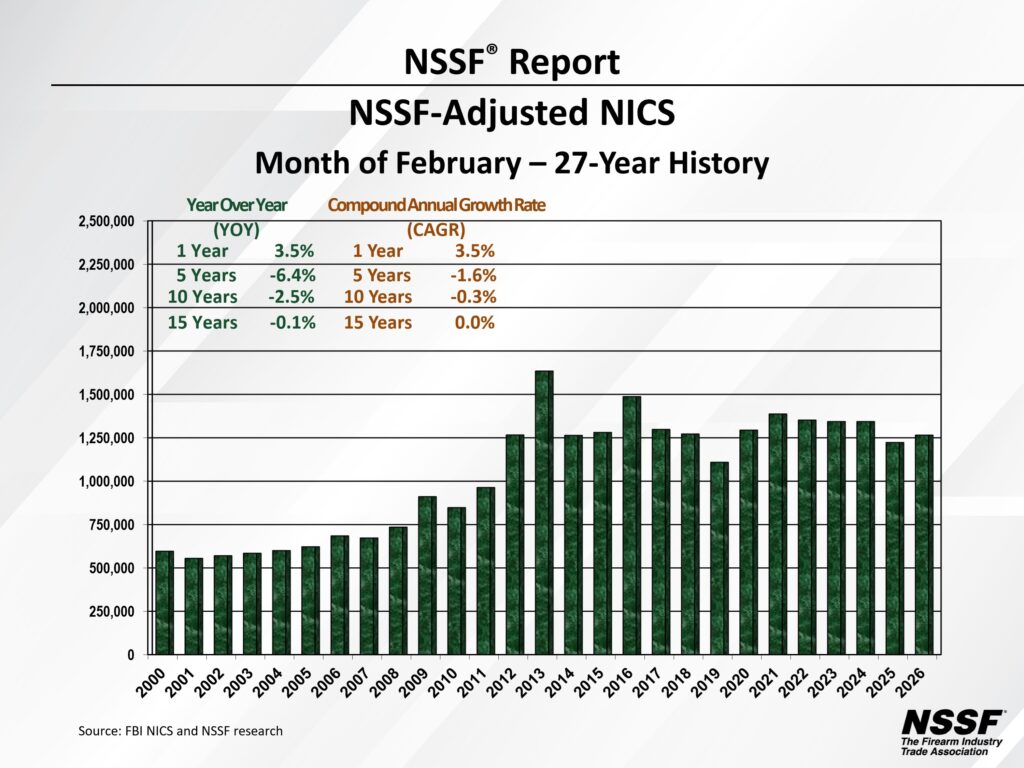 The February 2026 NSSF-adjusted National Instant Criminal Background Check System(NICS) figure of 1,265,320 is an increase of 3.5 percent compared to the February 2025 NSSF-adjusted NICS figure of 1,222,980.
