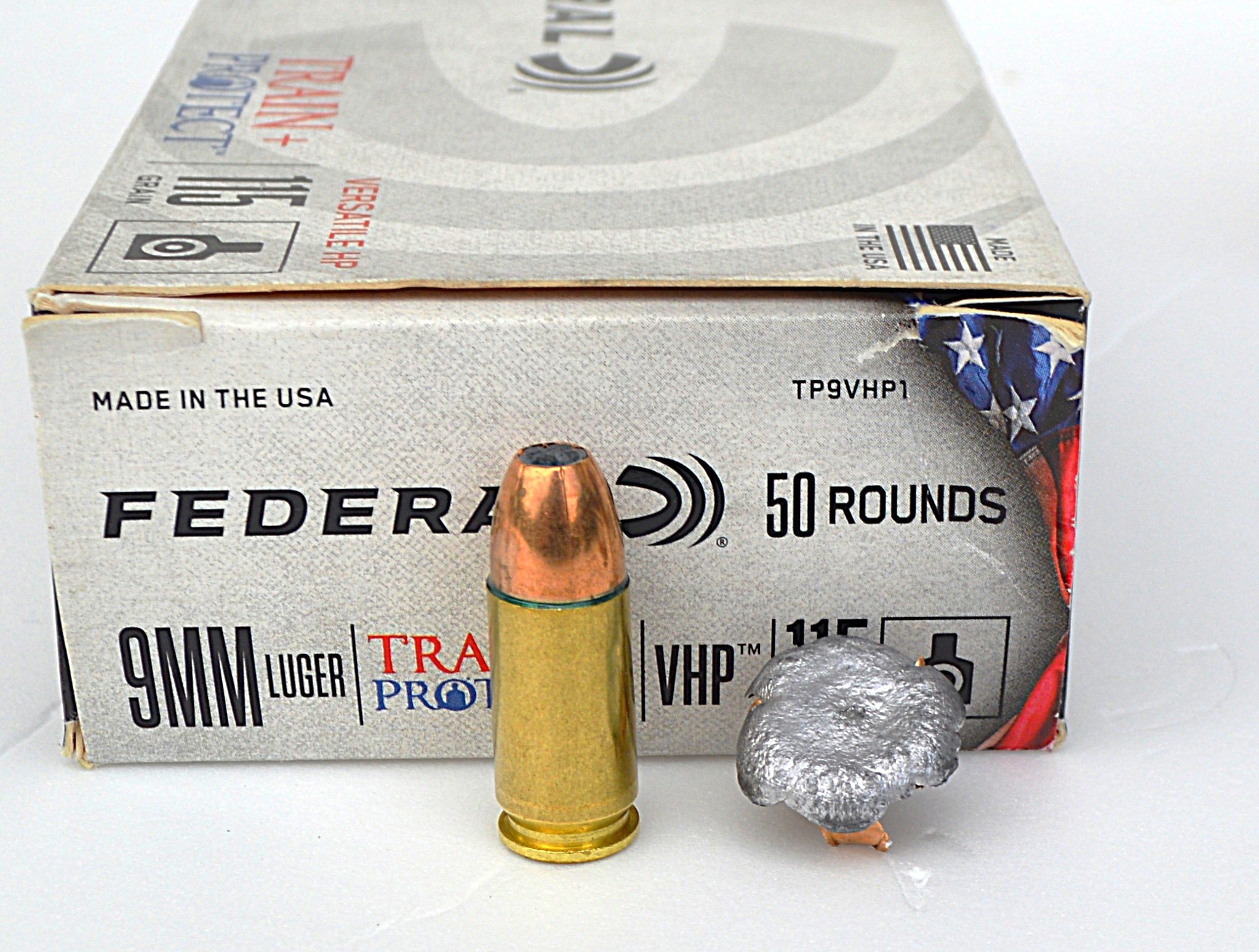 The 9mm Luger and .38 Special +P are realistic minimums. Once you master the 9mm you may move to a heavier caliber if you feel limited, but not before. Choose good quality ammunition not a trick load from an unknown. What ammunition passed institutional test programs? The choice of the FBI after extensive testing? State police load?