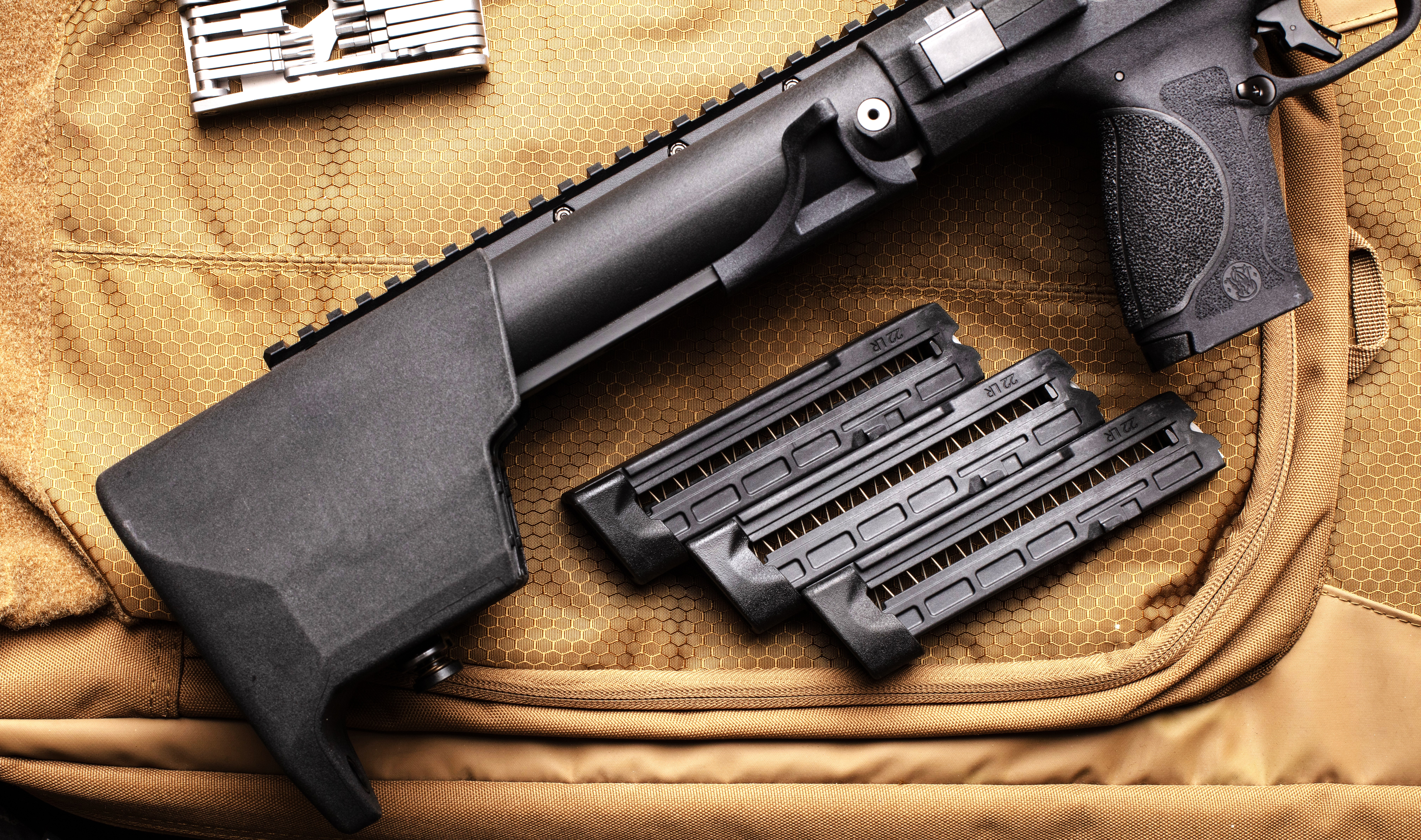 The stock features an excellent design, comfortable for most shooters, with a butt pad that ensures the stock stays rigidly into the shoulder. The polymer receiver is light and compact, and the handle is the same as te one found on the Smith & Wesson Military & Police 9mm compact.