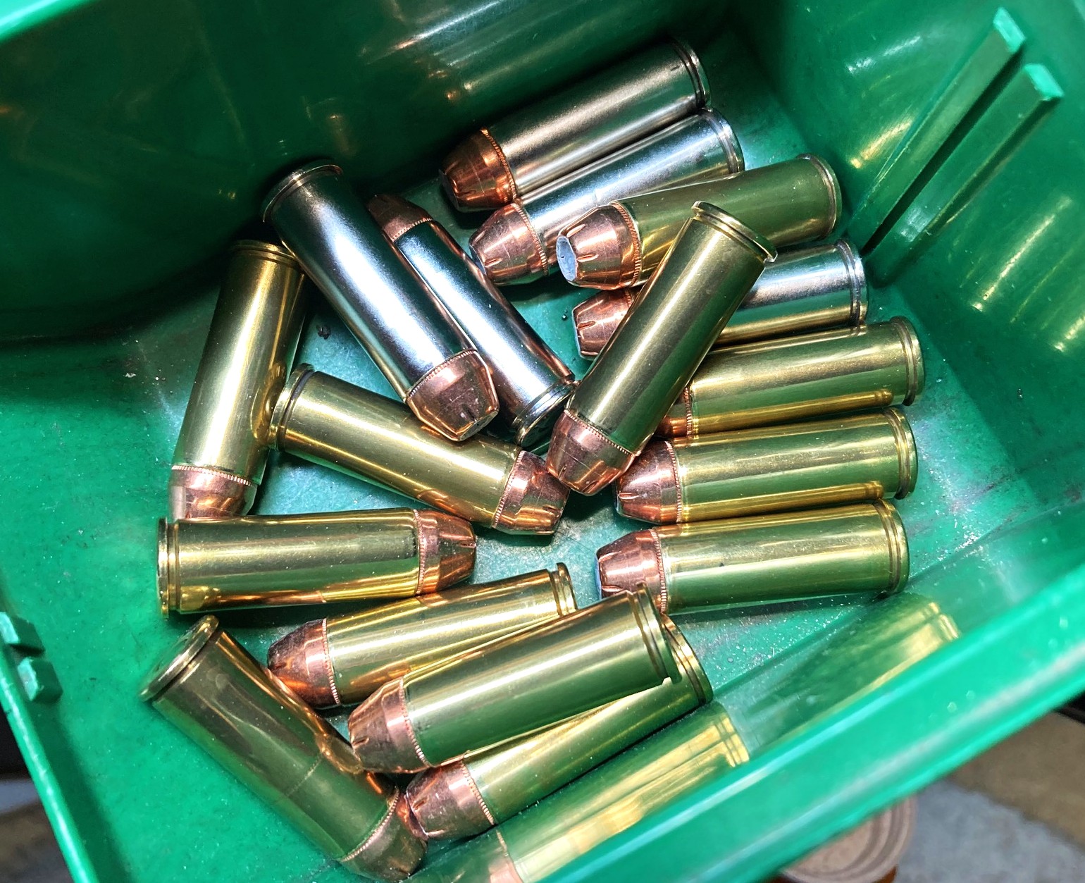 A partial batch of new .45 Colt handloads ready for action.